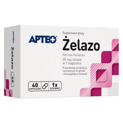 Eisen APTEO ist ein Nahrungsergänzungsmittel, das 25 mg Eisen pro Kapsel enthält.
